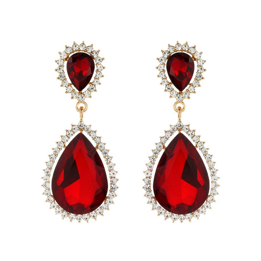 Red Teardrop Earrings with Rhinestone and Flower Detail