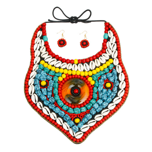 Turquoise Stones, Cowrie Shells, and Multi Color Bead Bib Necklace Set