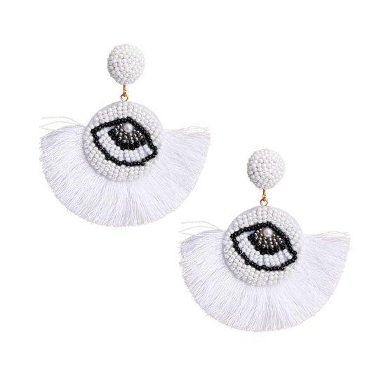 Sold outWhite Beaded Eye Tassel Earrings