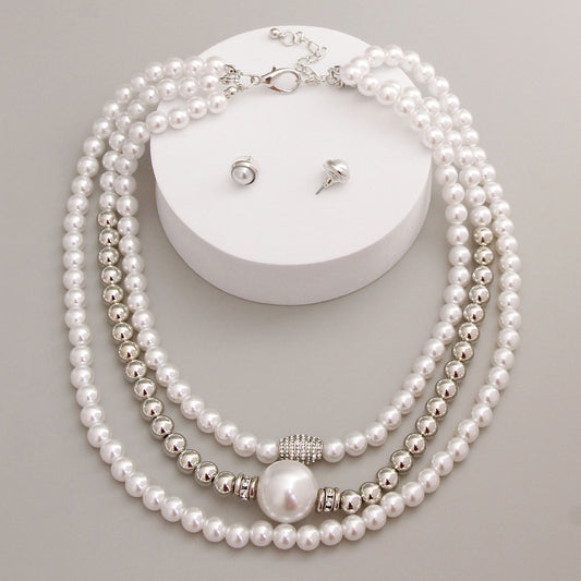 White and Silver Pearl 3 Strand Necklace