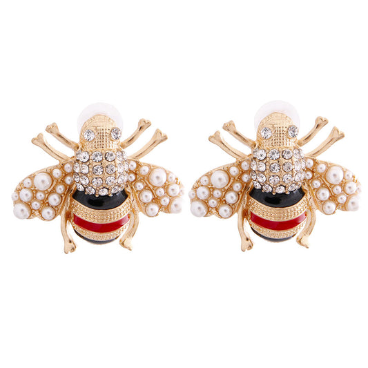 Designer Style Pearl and Rhinestone Gold Bee Earrings