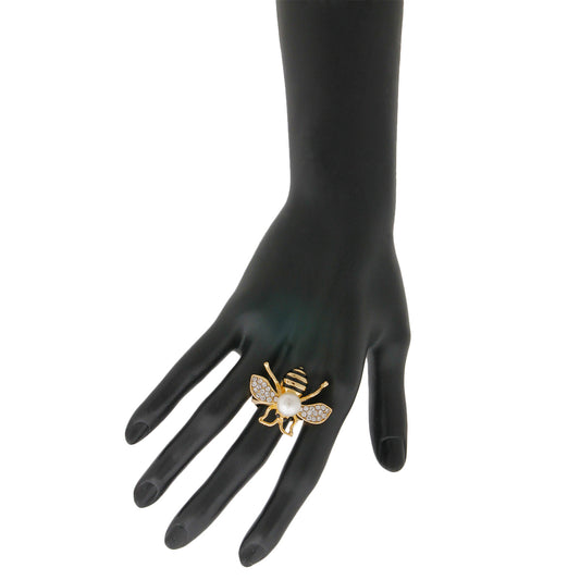 Designer Style Rhinestone Bee Stretch Ring with Pearl Detail