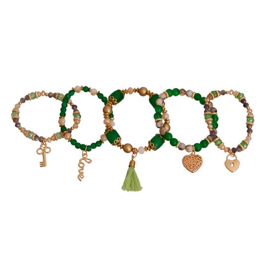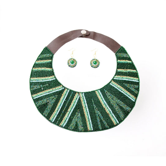 Green Striped Round Beaded Bib Necklace Set . Leather Neckline and Snap Closure