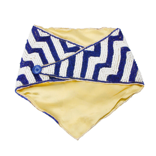 Handmade Embroidered Scarf Necklace Set with Chevron Pattern Blue and White Beads