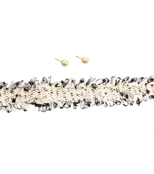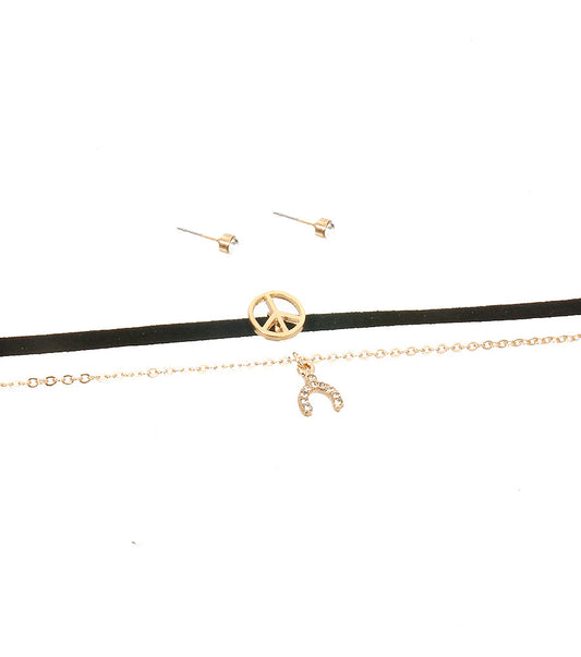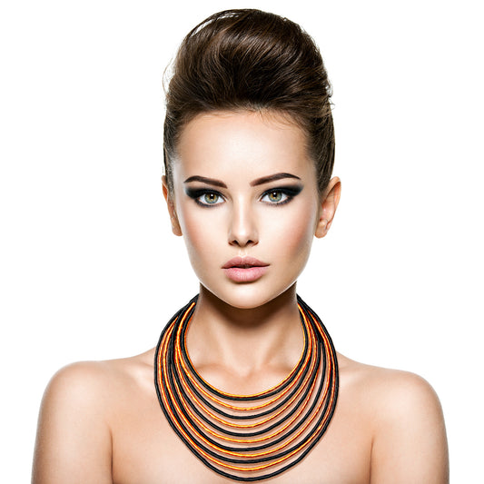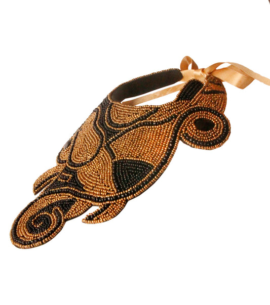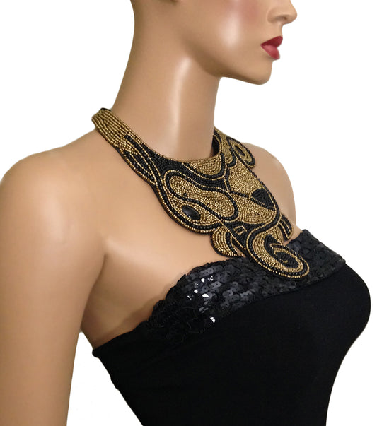 Leather Backed Black and Gold Bead Swirl Bib Necklace