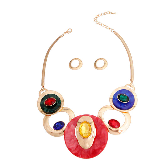 Multi Color Bead with Emerald Crystal Center Bib Necklace Set