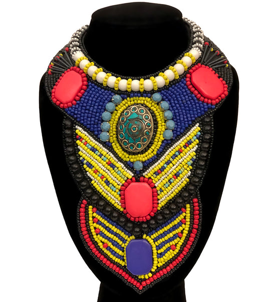 Multi Color Bead Raised Collar Long Bib Necklace Set