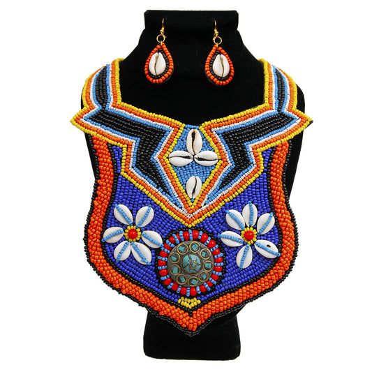 Multi Color Bead Bib Necklace Set with Cowrie Shell and Mosaic Detail