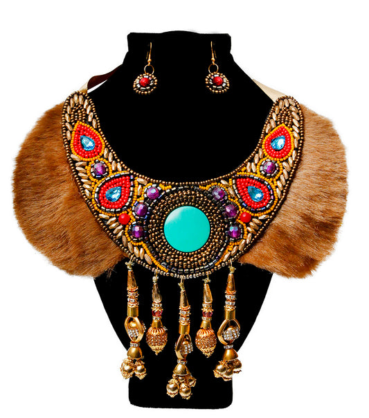 Multi Color Bead and Fur Collar Bib Necklace
